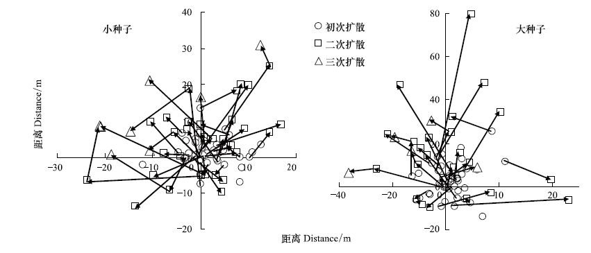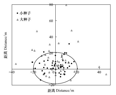 2 结果与分析结果表明:访问种子站的动物主要是大林姬鼠,偶见棕背 ,没有发现花鼠和红松鼠。种子大小不影响鼠类对胡桃楸种子分散贮藏的偏好,大、小胡桃楸种子的埋藏率接近(χ2=0.045,df=1,P=0.831),且每个贮藏点都只含有一粒种子。大种子被扩散的平均次数为1.67±0.10,小种子为1.91±0.10,差异不显著(F=2.710,df=1,P=0.103)。多次扩散使胡桃楸种子逐渐远离种子释放点,进一步扩大了胡桃楸种子的分布范围(图 1)。大种子比小种子的分布范围更广,小种子多分布在距离种子释放点20 m左右的范围内,而大种子的贮藏点最远距种子释放点可达到80 m(图 2)。