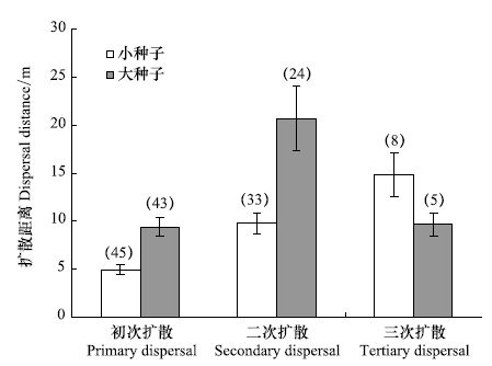 胡桃楸小种子的初次、第二次、第三次扩散的平均距离分别是(4.91±0.55) m、(9.74±1.12) m、(14.86±2.33) m,差异极显著(F=16.789,df=2,P<0.01);第三次扩散的平均距离显著高于初次(P<0.01)和第二次(P<0.05)的平均扩散距离,第二次扩散的平均距离显著高于初次的平均扩散距离(P<0.01)。大种子初次、第二次、第三次的平均扩散距离分别是(9.36±0.97) m、(20.69±3.34) m、(9.63±1.17) m,差异极显著(F=8.923,df=2,P<0.01);大种子的第二次平均扩散距离显著高于初次(P<0.01)和第三次(P=0.039)的平均扩散距离,初次和第三次之间则无显著差异(P=0.957)(图 3)。