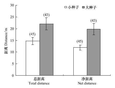 结果显示:尽管更多的胡桃楸小种子被多次分散贮藏(图 3),但大种子分散贮藏后的平均扩散总距离还是大于小种子(22.03±2.64) m>(14.70±1.56) m(F=5.840,df=1,P=0.018)。大、小胡桃楸种子分散贮藏后的平均净距离分别为(19.79±2.44) m和(11.94±1.02) m,二者之间差异显著(F=9.104,df=1,P<0.01)(图 4)。