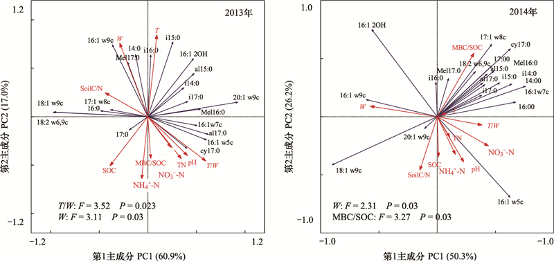 对4种处理2个观测时间的土壤微生物群落结构与土壤理化性质的冗余度分析(RDA)表明, 10个土壤理化性质变量在2013年和2014年分别共同解释了土壤微生物群落结构变化的77.9%和76.5%(图 4)。蒙卡洛检验结果显示, 土壤温湿度比值、土壤湿度是显著影响2013年微生物群落结构的主要因子;土壤湿度、土壤微生物熵是显著影响2014年微生物群落结构的主要因子。结合微生物群落结构主成分载荷因子分析可知(表 3), 不同处理时间, 土壤湿度均与主成分分析中PC1显著相关的微生物PLFA生物标记类型呈现显著负相关关系, 而土壤温湿度比、MBC/SOC与其呈现显著正相关关系(图 4)。
