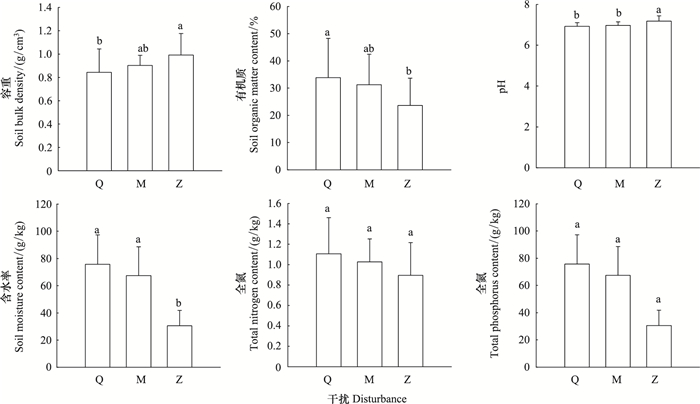 图 1 不同旅游踩踏干扰地点土壤理化性质 Fig. 1 Soil environment parameters in different tourism disturbance plots BD:容重;MC:含水率;OM:有机质;TN:全氮;TP:全磷; Q、M、Z代表不同干扰区, 依次代表非踩踏区, 轻度踩踏区, 重度踩踏区; 不同小写字母表示在P<0.05水平上差异显著 |
