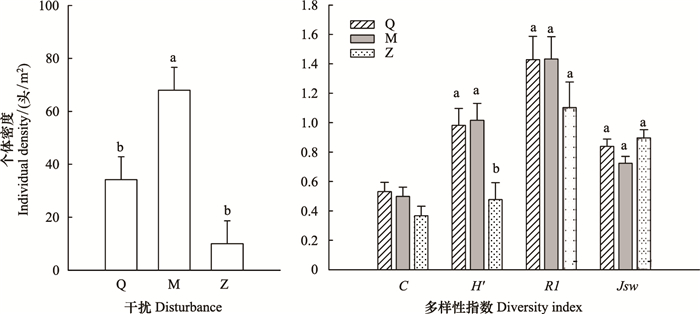 不同踩踏强度干扰区大型土壤动物个体数差异明显(P < 0.001)(图 2), 其中轻度踩踏区(M)个体密度最大(68头/m2), 重度踩踏区个体密度最小(10头/m2), 个体密度相差6.8倍(图 2)。