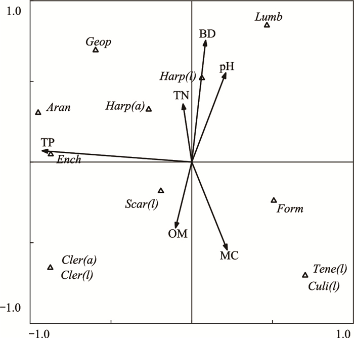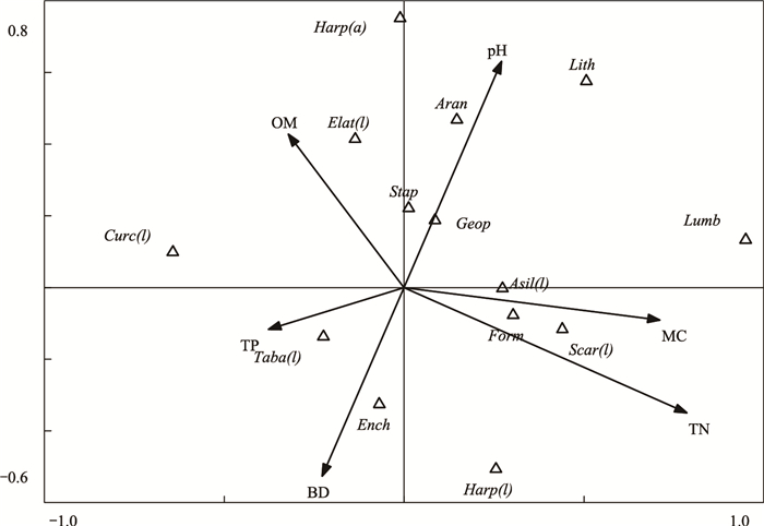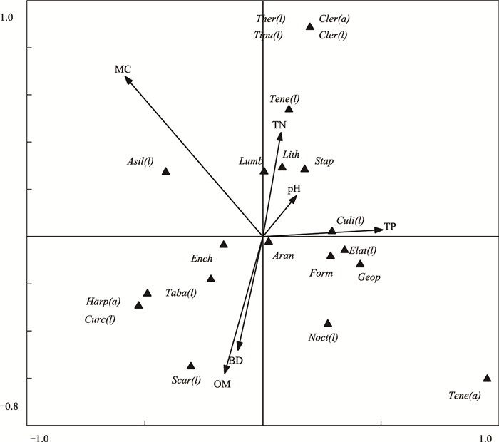 重度踩踏区大型土壤动物类群与土壤理化性质DCA排序结果表明4个排序抽的长度为0.000、7.760、2.384、1.462。第二轴最长, 长度长于4, 因此运用CCA分析重度踩踏区大型土壤动物类群多度与土壤理化性质之间的关系。第一轴与第二轴的Eigenvalues值分别为0.591和0.476, 分别解释了59.1%和47.6%的大型土壤动物种群变化, 大型土壤动物—环境相关系数分别是分别为0.906和0.876, 分别对应了37.2%和29.9%的种群—环境关系。6个理化因子对重度踩踏区大型土壤动物种群分布存在不同程度的影响, 其中TP影响最大, 其次为BD、MC、pH(图 5), TP与第一轴呈最大负相关, 相关系数为-0.84, 即排序轴从左到右, TP降低。与第二排序轴相关性较大的是BD, 相关系数为0.66, 即沿排序轴方向由上到下, BD逐渐降低, 其次为pH和MC, 相关系数分别为0.48和-0.48, 即沿排序轴方向由上而下, MC逐渐增加, pH逐渐降低(表 3)。重度踩踏区大型土壤动物共12类:地蜈蚣目、正蚓科、蜘蛛目、地甲科成虫、地甲科幼虫、线蚓科、金龟甲科幼虫、蚁科、郭公甲科成虫、郭公甲科幼虫、拟步甲科幼虫、蚊科幼虫。