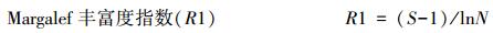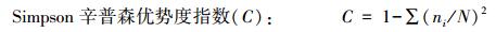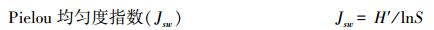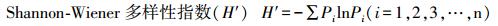 式中, Pi是第i种的个体数占总个体数的比例, Pi=Ni/N, Ni为第i种物种个体数, N为所在群落的所有物种的个体数之和, S为每个样品中的物种总数。