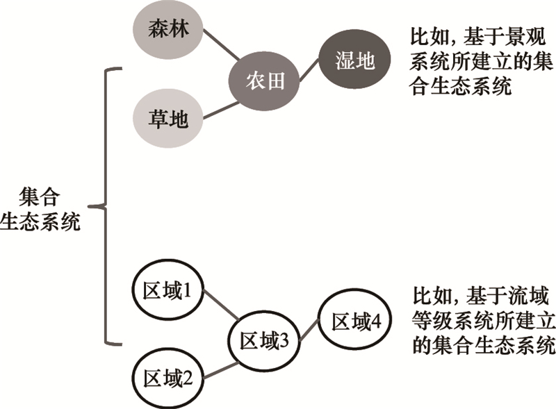 一般来讲, 构建一个经验化的集合生态系统, 有2种典型的模式:(1)不确定的集合生态系统边界-以特定类型的生态系统为局域生态系统-不明确的局域生态系统空间连接, 可以称为“异质生态系统集合”, 如某经济区或政治区内的森林-草地-农田-湿地集合生态系统;(2)确定的集合生态系统边界-以地理单元为局域生态系统-明确的局域生态系统空间连接, 可以称为“特定空间区域集合”, 如流域-亚流域集合生态系统(图 11)。