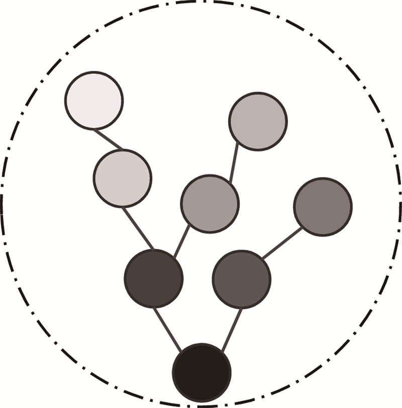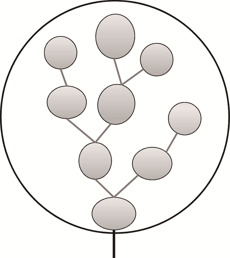 | 图 13 流域集合生态系统之特定空间区域集合的示意图 Fig. 13 Diagram of a set of sub-watersheds and main stream regions which are constructed as a meta-ecosystem 不同大小的小圆圈代表不同面积的亚流域或干流区间, 大圆圈代表流域的边界, 小圆圈间的连接线代表不同亚流域或干流区间之间的流域生态系统过程, 穿越大圆圈的连接线代表流域与外环境之间的流域生态系统过程 |