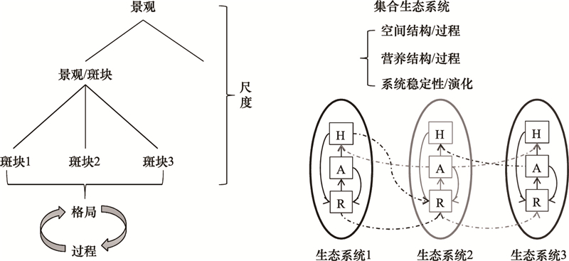 | 图 2 生态系统空间异质性研究的重要分析路径——景观概念的体系和集合生态系统概念的体系 Fig. 2 Pathways for studying spatial heterogeneity of ecosystem: the landscape conceptual system and the meta-ecosystem conceptual system R:无机营养资源, resources;A:自养生物, autotrophs;H:异养生物, heterotrophs |