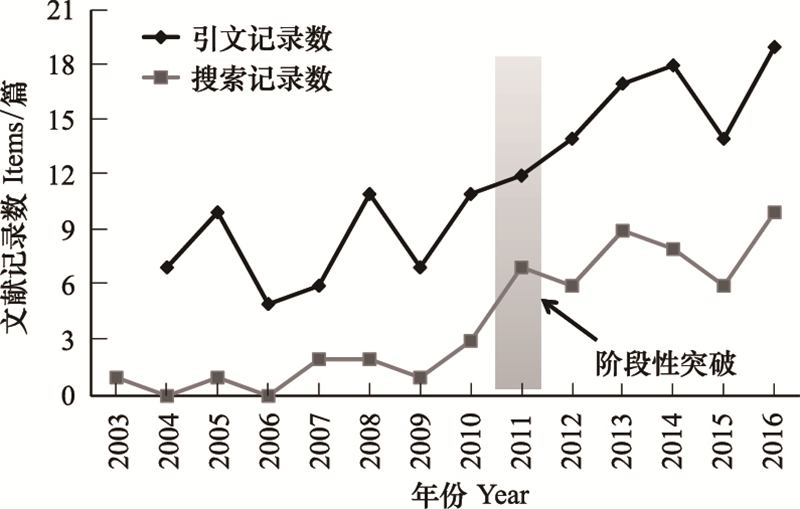 | 图 3 集合生态系统研究的相关文献记录数 Fig. 3 Published items and citations of meta-ecosystem in each year 引文记录数:“Loreau M, Mouquet N, Holt R D. Meta-ecosystems: A theoretical framework for a spatial ecosystem ecology. Ecology Letters. 2003, 6(8): 673-679.”[5]在Web of Science核心集中的施引文献记录数。搜索记录数:以“meta-ecosystem” OR “metaecosystem”为主题词在Web of Science核心集中搜索所得的文献记录数(2017-5-1) |
