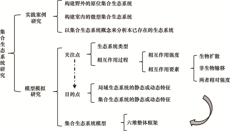 在目前的研究中, 对集合生态系统主要有两种理解:狭义的和广义的, 在狭义的理解中, 对集合生态系统的研究主要是探讨其内部作用、维持和演化机制, 在广义的理解中, 对集合生态系统的研究主要是探讨相邻生态系统之间一方对另一方的影响。针对对集合生态系统进行狭义理解的集合生态系统研究进行分析统计, 可以将其所研究的集合生态系统用一个六维整体框架来描述。根据这个六维整体框架来分析, 集合生态系统研究有从对简单的“(开放, 二元, 同型, 单向, 两级, 简单)”的集合生态系统类型研究向对复杂的“(封闭, 多元, 异型, 双向, 多级, 复杂)”的集合生态系统类型研究的发展趋势, 但总体来看, 目前集合生态系统研究还只是刚开始, 还有很多的研究空缺。研究集合生态系统有两类方法:实践案例研究和模型模拟研究, 早期模型模拟研究占多数, 近几年实践案例研究开始增多。